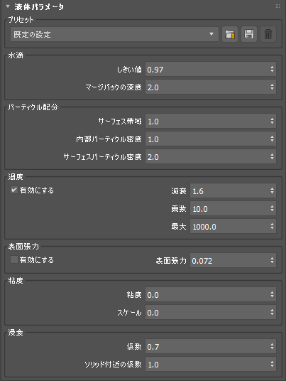 - プリセットされた液体パラメータをロード、保存、および削除します。リストには、ビール、血液、カラメル、クリーム、ハチミツ、ケチャップ、ラテックス塗料、メープルシロップ、水銀、ミルク、潤滑油、オリーブ オイル、オレンジ ジュース、パテ、シリコン、歯磨き粉、トランスミッション液、水のプリセットが含まれています。
