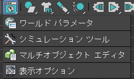 このフライアウトのボタンで、[MassFX ツール](MassFX Tools)ダイアログの他のパネルに直接移動できます。 また、 [シミュレート](Simulate)メニュー [ツール - MassFX](Tools - MassFX)