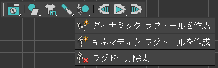 このフライアウトのコントロールを使用して、ボーン システムまたは character studio Biped を MassFX シミュレーションに含めるか、キャラクタをシミュレーションから削除することができます。 キャラクタのボーンまたは関連付けられたスキン メッシュを選択して、[ラグドール](Ragdoll)コマンドを選択します。これは、システム全体に影響があります。 「MassFX ラグドール」を参照してください。