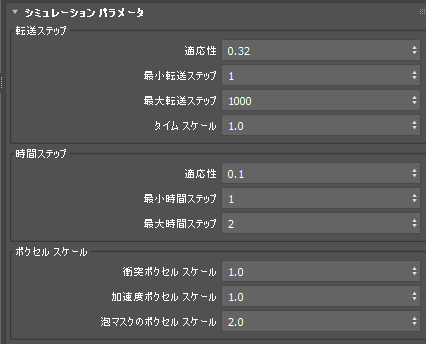 この設定を一度に急に増やさないでください。特に 1.0 に近い値の場合は注意が必要です。値を急に増やすと、不要な計算に長い時間がかかることがあります。また、距離はボクセルの長さで計測されることに注意してください。つまり、ベース ボクセル サイズが小さいほど、任意の速度でパーティクルに対して余分な反復がトリガされる可能性があります。