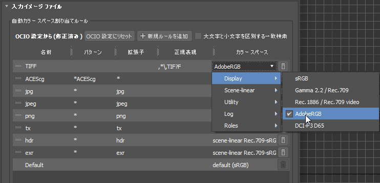 - イメージ入力をカラー スペースに自動的に割り当てるルールを編集して、使用するカラー スペースおよび命名規則との一致度を高めることができます。また、ルールの読み込みや書き出しを行って、シーン間で共有することもできます。詳細は、「カラー スペース割り当てルールを編集するには」を参照してください。
