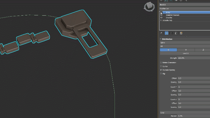 新しい[Array By Element]メソッドが、[配列](Array)モディファイヤの[分配](Distribution)ロールアウトに追加され、要素の配置をより詳細にコントロールできるようになりました。また、新しい[変動](Variation)パラメータを使用して、葉序のらせん状配列のクローンの角度を調整できます。