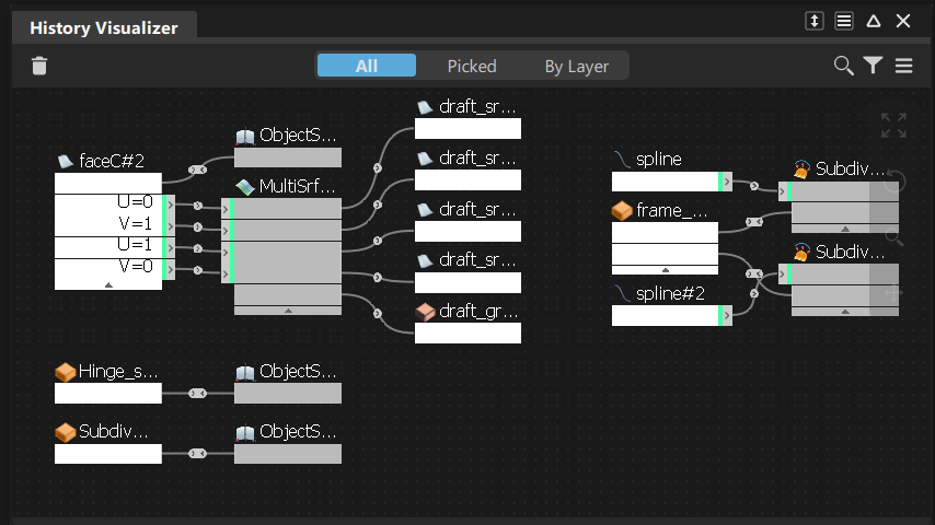 既定では、History Visualizer に、ファイル内のすべてのオブジェクトのコンストラクション ヒストリのグラフ ビューが表示されます。グラフに表示されるのは、コンストラクション ヒストリがあるオブジェクトのみです。