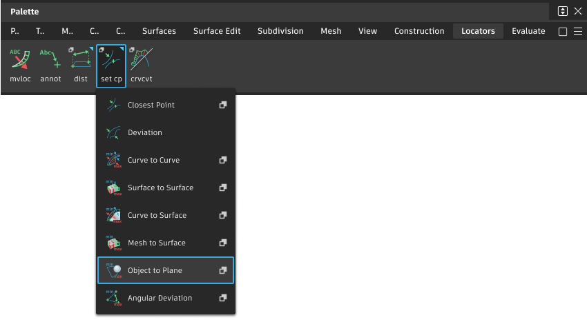 コンストラクション プレーンとカーブ、サーフェス、またはメッシュ間の最小偏差および最大偏差を表示する測定を追加します。最小、最大、平均のラベルの付いた 2 つのオブジェクト間の偏差を表すロケータを作成します。