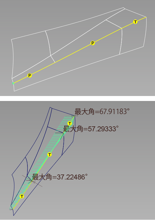 G1 ロケータが表示され、接線連続性が達成されている場合は緑色の T が示され、達成されていない場合は黄色の T が示されます。既定では、サーフェス間の最大角度偏差がエッジ ラベルとともに表示されます。境界に沿った接線の切れ目の大きさを示すコームを表示することもできます。