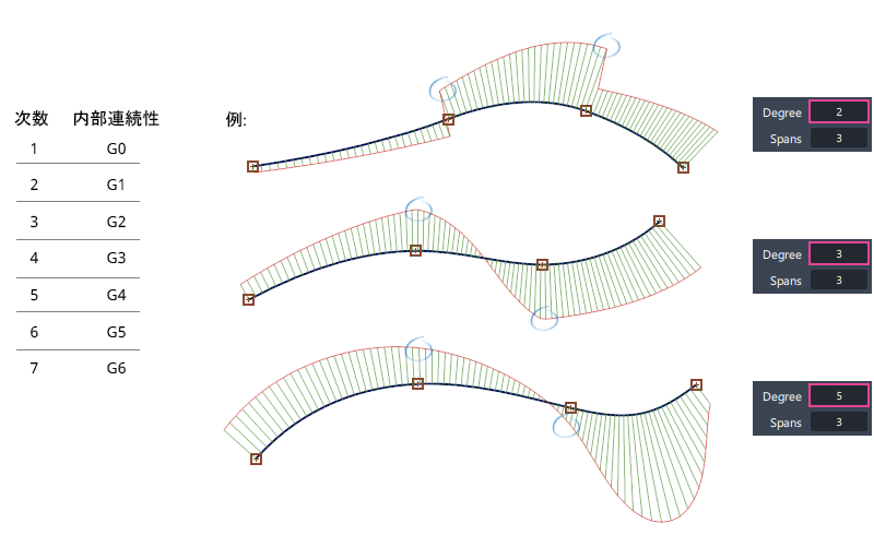 マルチスパンのカーブまたはサーフェスを構築する場合、スパン境界(エディット ポイントまたはアイソパラム)で実現される内部連続性は、カーブまたはサーフェスの次数によって決まります。