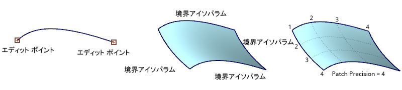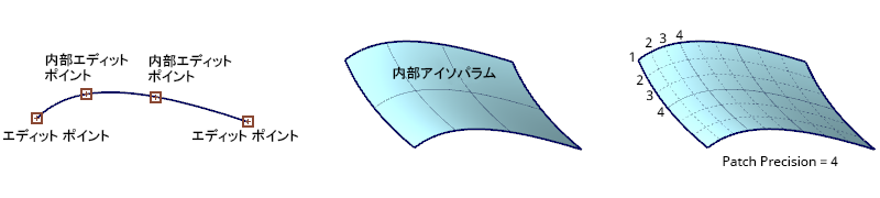 エディット ポイントとアイソパラムはスパンの境界を定義し、カーブまたはサーフェスのスパンの数を示します。