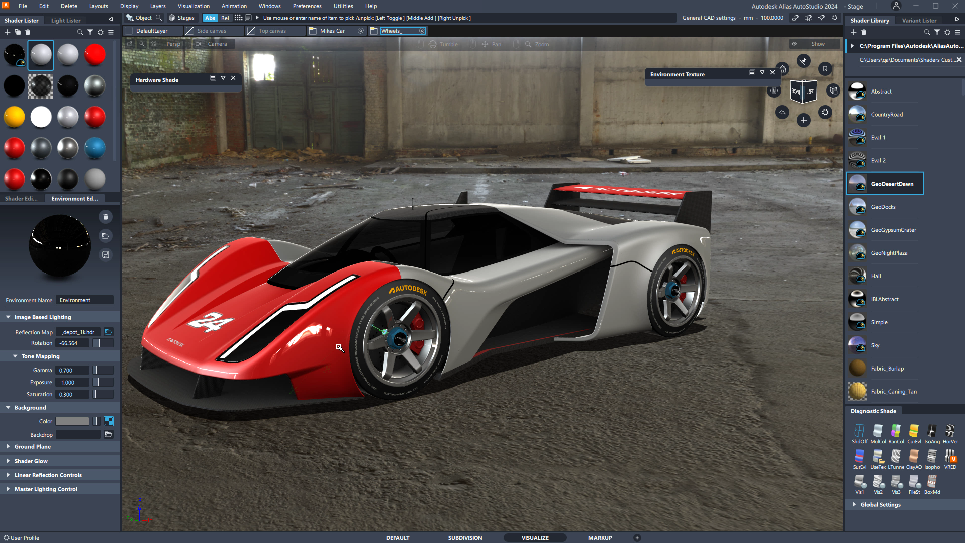 シーンのカスタムジオメトリ環境を作成して、バックグラウンドおよびイメージベースド ライティング効果を追加します。環境と反射マップの配置を調整して、環境を最適化します。新しい環境を作成したら、カスタム シェーダ ライブラリに追加します。