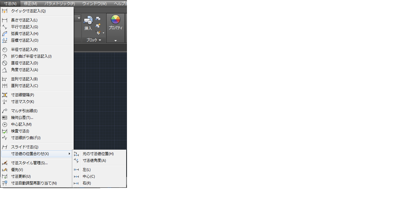 次のメニューの例では、[寸法値の位置合わせ]メニュー項目は、[寸法]メニューの 17 番目のインデックスに挿入されています。[寸法値の位置合わせ]メニュー項目は acSubmenu タイプです。例にあるその他のメニュー項目はすべて、acMenuItem タイプまたは acMenuSeparator タイプです。[寸法値の位置合わせ]メニューが選択された場合に現れる小さなカスケード メニューは、AddSubMenu メソッドが返す新しいメニューです。このメニューには、AddMenuItem および AddSeparator メソッドを使用して項目が追加されています。