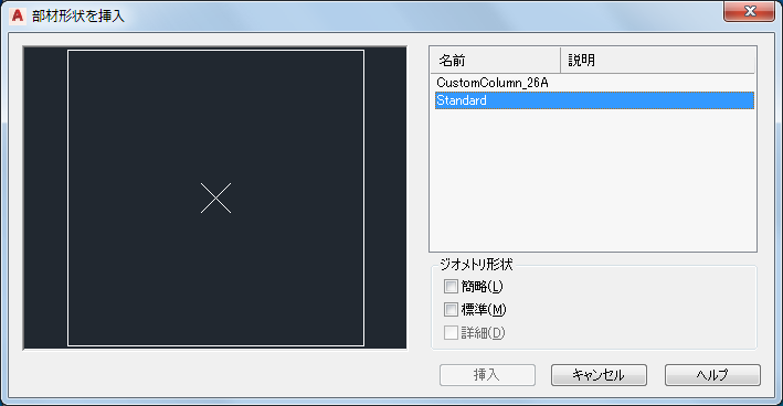 カスタム形状に定義された 1 つまたは複数のジオメトリを図面に挿入するには、次の手順を実行します。これにより、ジオメトリを編集するか、そのまま使用して、表示レベルの 1 つを、作成または編集する別のカスタム部材形状に定義します。