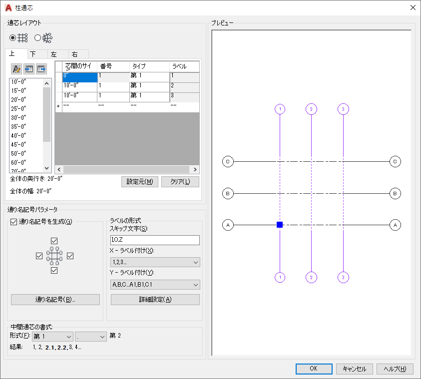 - これ以降にプライマリ通芯線を追加するとそのラベルとラベル値は、[柱通芯]ダイアログ ボックスの通芯の書式設定に従って生成されます。