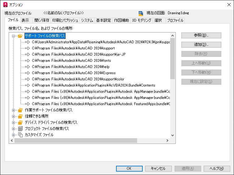 ソース ファイルが AutoCAD のサポート ファイル検索パスにある場合は、ファイル名を指定するとき、パス名を省略できます。検索パスを設定するには、AutoCAD のアプリケーション メニュー [オプション]をクリックし、[ファイル]タブをクリックしてから[サポート ファイルの検索パス]を選択します。