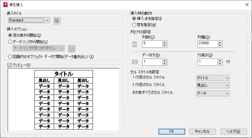 表のサイズと位置を指定します。ポインティング デバイスを使用するか、コマンドのプロンプトに対して座標値を入力します。このオプションを選択した場合、行数、列数、列幅、行高さは、窓のサイズおよび行と列の設定により決まります。