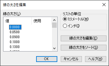 線の太さのリストを値でソートします。線の太さの値を変更した場合、[線の太さをソート]を選択するとリストがソートし直されます。