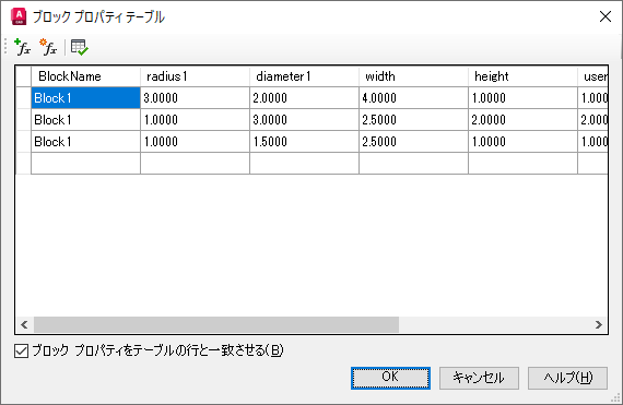 [ブロック プロパティ テーブル]ダイアログ ボックスでは、列見出しがパラメータで、行でプロパティ セットの値を定義します。選択したブロック参照を定義した値に設定することができます。ブロック定義テーブルごとに、テーブルは 1 つです。