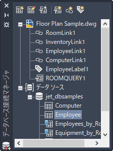 [データベース接続マネージャ]は、複数のボタンとツリー表示で構成されたウィンドウで、ドッキングしたりサイズを変更することができます。[データベース接続マネージャ]から[データ ビュー]ウィンドウを開くと、データベース テーブルを表示したり編集することができます。また、さまざまな 「データベース オブジェクト」(リンク テンプレート、ラベル テンプレート、クエリーなど)を 図面に関連付けることもできます。