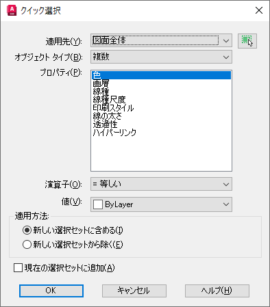 [現在の選択セットに追加]チェック ボックスをオンにすると、フィルタ条件が図面全体に適用されます。