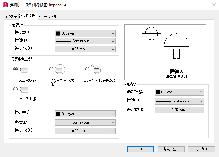 詳細ビューの詳細境界線、モデル エッジ、および接続線のプロパティを設定します。