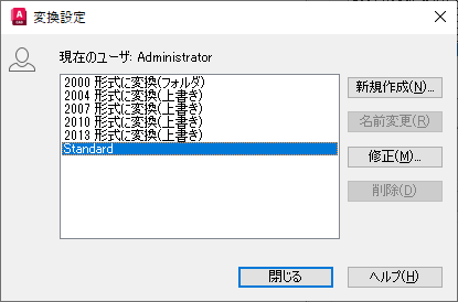 リストに表示されている変換設定の名前を変更します。変更できるのは、作成した変換設定の名前のみです。変換設定 Standard の名前は変更できません。