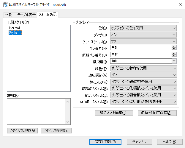 印刷スタイルは表形式で表示されます(リストの一番上にすべての印刷スタイルが左から右へ表示され、その下にそれぞれのプロパティが表示されます)。一般的に、印刷スタイルの数が少ない場合は、[テーブル表示]タブを使用した方が便利です。印刷スタイルの数が多い場合は、[フォーム表示]タブを使用した方が便利です。[フォーム表示]タブでは、左側に印刷スタイル名のリストが表示され、選択した印刷スタイルのプロパティが右側に表示されます。名前の付いた印刷スタイル テーブルの最初の印刷スタイルは Normal(標準)です。これは、オブジェクトの既定のプロパティを表しています(ユーザ定義の印刷スタイルは適用されません)。NORMAL(標準)スタイルは、変更も削除もできません。