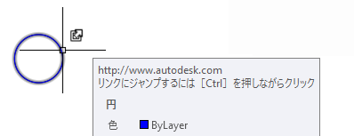 注: ハイパーリンク カーソル バッジとツールチップが前図のように表示されない場合は、次のセクションの手順を使用して、ハイパーリンクがオブジェクトにアタッチされていることを確認します。ハイパーリンクがアタッチされている場合、コマンド プロンプトに対して HYPERLINKOPTIONS と入力し、プロンプト「ハイパーリンク カーソル、ツールチップ、ショートカット メニューを表示しますか?」に対して y (はい)と入力すると、ハイパーリンク カーソル バッジとツールチップが有効になります。