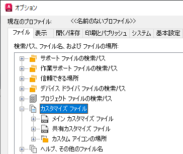 - [オプション]ダイアログ ボックスの[ファイル]タブで、[カスタマイズ ファイル]ノードの横のプラス(+)記号をクリックして展開します。
