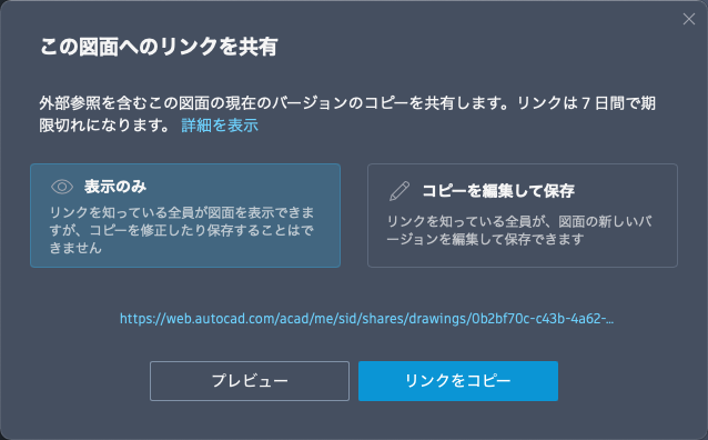 [共有]は、AutoCAD for Mac の ETRANSMIT[e-トランスミット]と同じように動作します。共有ファイルには、外部参照やフォント ファイルなど、関連するすべての従属ファイルが含まれます。 リンクを知っているすべてのユーザは、AutoCAD Web アプリで図面にアクセスできます。リンクは、作成後 7 日で有効期限が切れます。受信者の権限は、表示のみと編集と保存が可能の 2 つのレベルから選択できます。