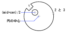 たとえば、線分の中点と円の中心の中間にある点を指定するには、(mid+cen)/2 と入力します。