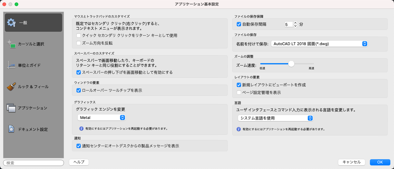 マウスのホイールを前方または後方に回転したとき、または Magic Mouse やトラックパッドでシングル スワイプしたときに、表示倍率がどれだけ変更されるかをコントロールします。(システム変数 ZOOMFACTOR)