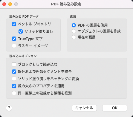 指定した PDF ファイルまたはアンダーレイからジオメトリ、塗り潰し、ラスター イメージ、TrueType 文字オブジェクトを読み込むためのオプションを設定します。