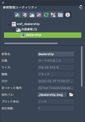 [参照管理ユーティリティ]パレットには、上辺に沿ってツールバーがあります。ファイル リストを右クリックすると、外部参照をアタッチしたり、アタッチした外部参照を管理するためのショートカット メニューが表示されます。選択した外部参照の詳細とサムネイル プレビューを表示するには、ツールバーの[詳細を表示]ボタンをクリックします。