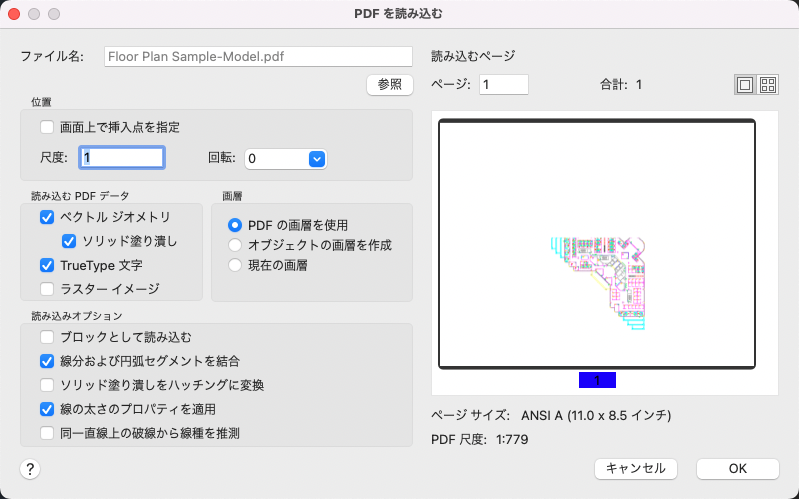 - 読み込むオブジェクトに対して他の読み込み尺度係数を指定することができます。ページごとに尺度が異なる可能性があるため、PDF ファイルからページを読み込む場合、システム変数 INSUNITS の設定は使用されません。