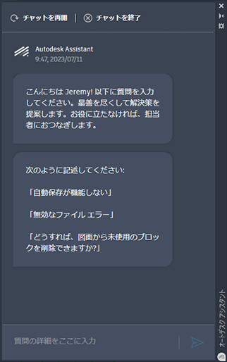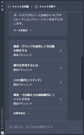 [オートデスク アシスタント]パレットが表示され、複数のソースのヘルプを検索したり、サポートに問い合わせたり、フィードバックを提供したりできます。検索結果は機械学習によって厳選されます。