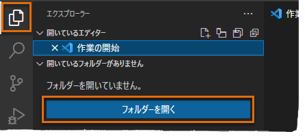 - Visual Studio Codeの[Activity Bar]の[Explorer]をクリックし、次に[Open Folder]をクリックします(または[File]メニュー > [Open Folder]/[Open]をクリックします)。