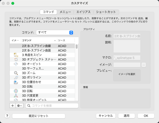カスタム コマンドは、コアな AutoCAD 2024 コマンドまたはサード パーティによって定義されたコマンドの起動に使用することができます。コマンドには AutoLISP コードを含めることもできます。