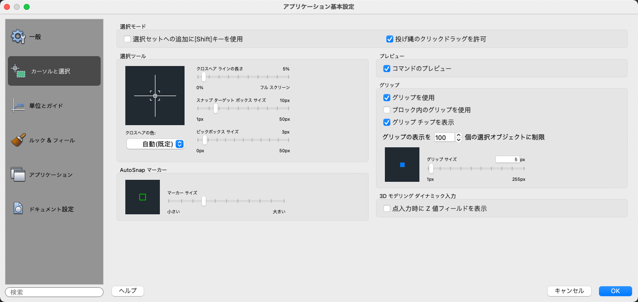 [カーソルと選択]タブ ([アプリケーション基本設定]ダイアログ ボックス)