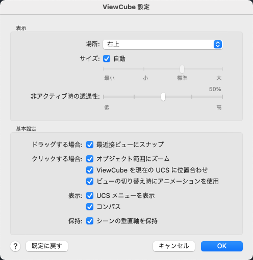[自動]を選択すると、ViewCube ツールのサイズは、アクティブなビューポートの現在のサイズ、アクティブなレイアウトのズーム倍率、または作図ウィンドウのサイズやズーム倍率に基づいて調整されます。