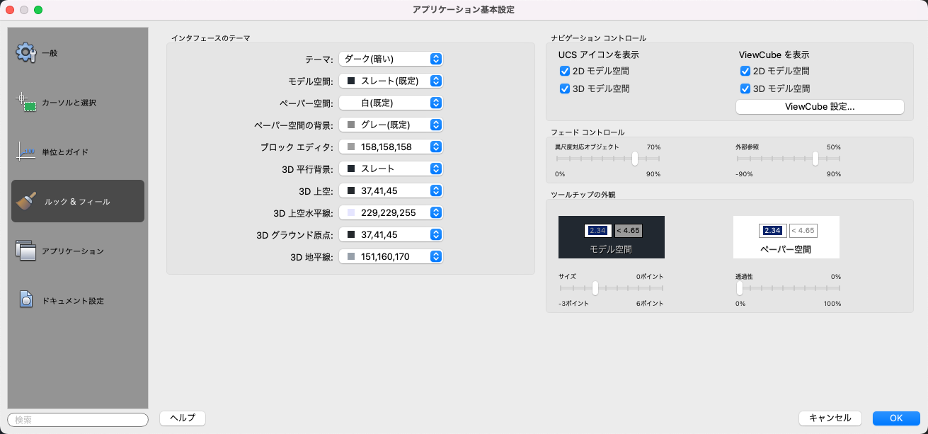 ステータス バー、パレット、図面ウィンドウなどの要素に適用するテーマをコントロールします。テーマとして、[暗い]または[明るい]を選択できます。