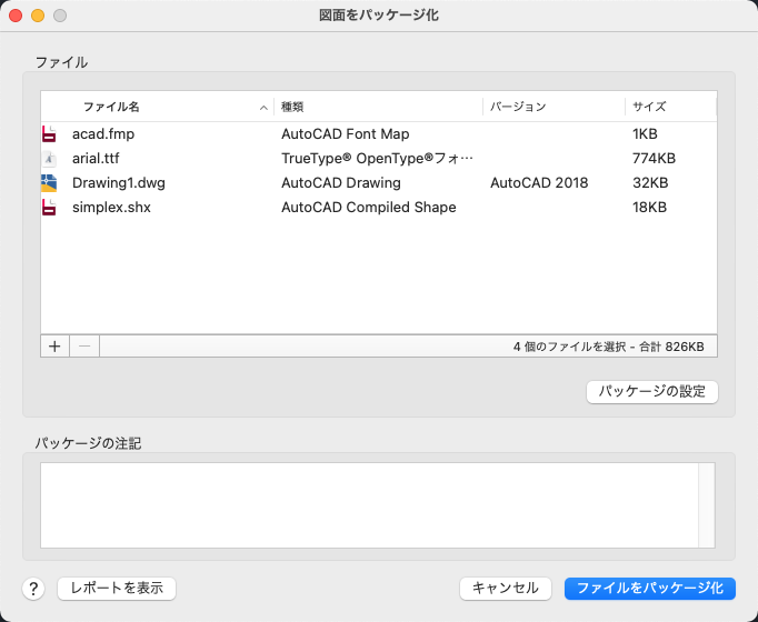 既定では、現在の図面に関連付けらていれるすべてのファイル(関連する外部参照、印刷スタイル、フォントなど)が一覧表示されます。転送パッケージに他のファイルを追加したり、既存のファイルを除外することができます。