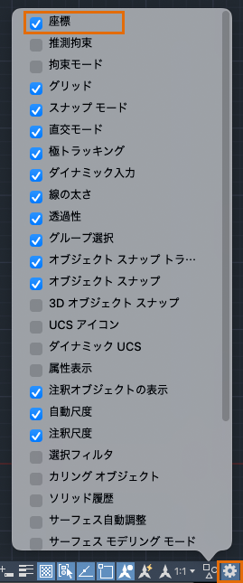 注: ステータス バーに座標が表示されていない場合は、ステータス バーの設定から[座標]を選択します。