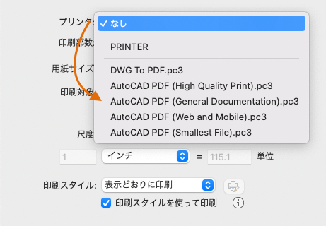 [プリンタ/プロッタ]ドロップダウン リストから、 [AutoCAD PDF (General Documentation).pc3] を選択します。