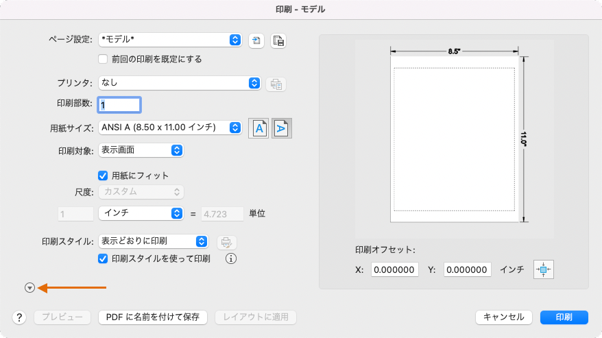 [印刷]ダイアログ ボックスの一部のオプションを非表示にするか、すべてのオプションを表示するかをコントロールするには、示されている矢印をクリックして展開します。
