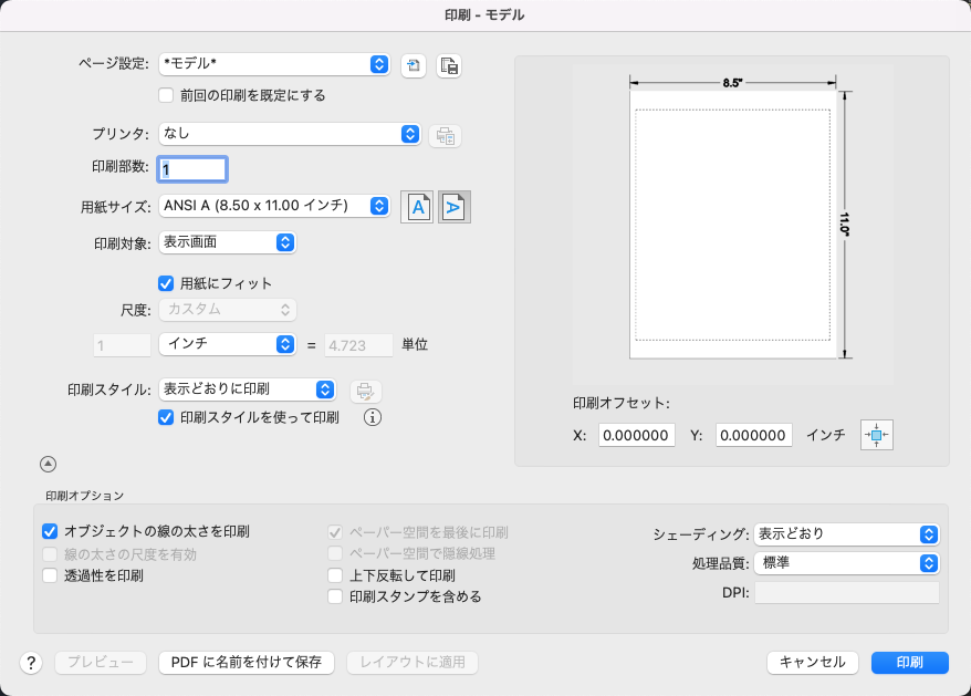 印刷の設定作業が簡単になるように、このような設定の集まりを保存し、名前で呼び出すことができます。これを「ページ設定」と呼んでいます。 ページ設定を使用することで、異なるプリンタでの印刷、グレースケールでの印刷、図面からの PDF ファイルの作成などに必要な設定を格納することができます。