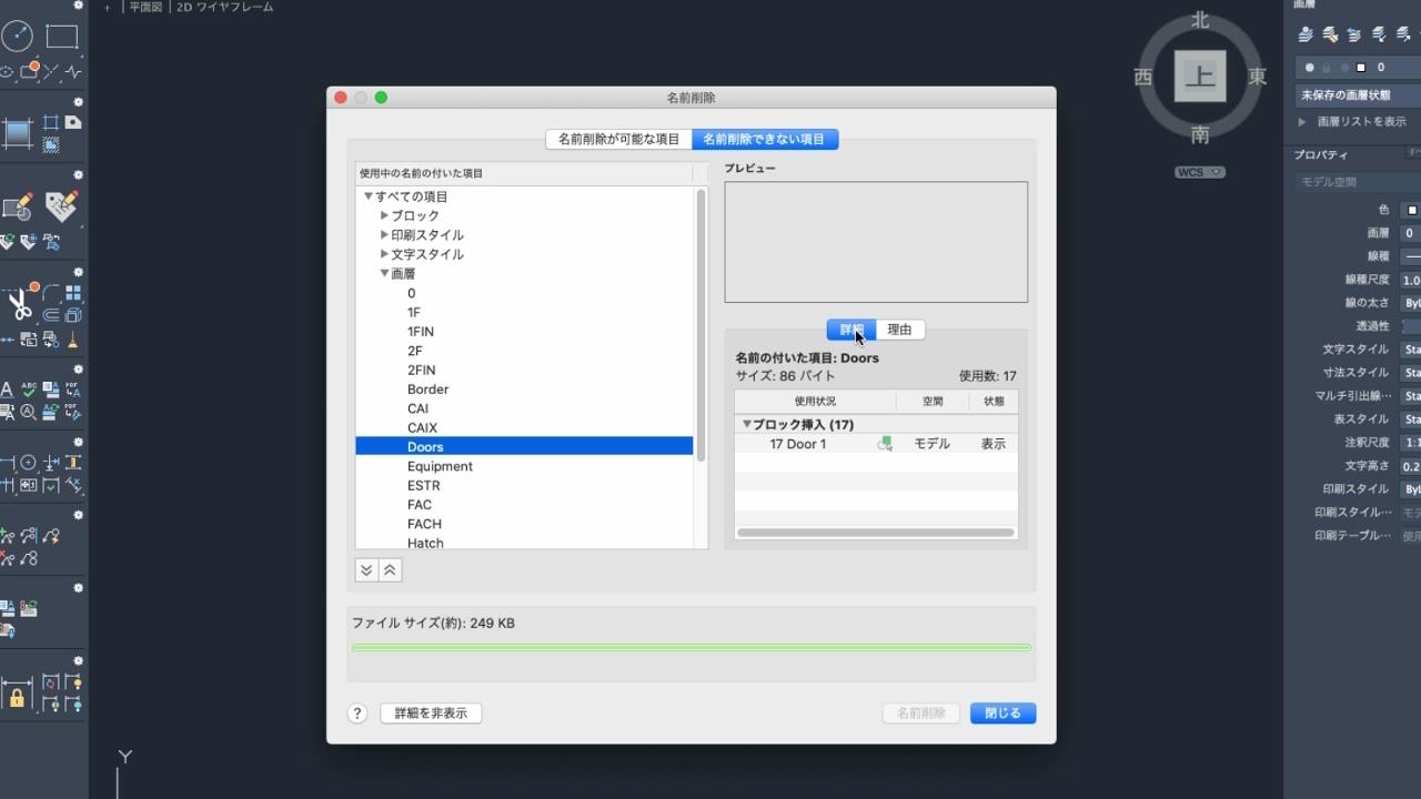 [名前削除]ダイアログ ボックスには、名前削除できないオブジェクトを表示できます。名前削除が可能な項目のリストと名前削除できない項目のリストの表示を切り替えることができます。