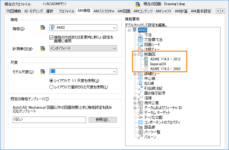 AutoCAD Mechanical 2024 ツールセットでは、新しい ANSI 規格の履歴が新しい図面の既定の規格として使用されます。旧形式の図面を開くと、既定の規格が古い規格の履歴に変更されます。[オプション]ダイアログ ボックスで、規格の履歴を変更することができます。
