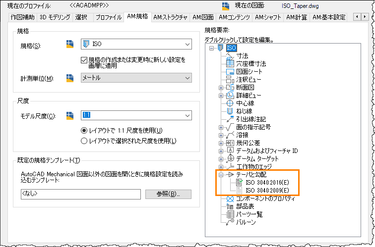 AutoCAD Mechanical 2024 ツールセットでは、旧形式の図面を開くと、既定の規格が古い規格の履歴に変更されます。[オプション]ダイアログ ボックスで、規格の履歴を変更することができます。