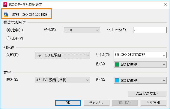 [ISO のテーパと勾配設定]ダイアログ ボックスに、新しい履歴が表示されます。