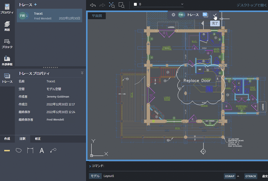 同僚が AutoCAD デスクトップ(Windows または Mac)で図面を開くと、新しいトレースがあれば通知されます。受信者は、トレースを開いて追加された内容を確認し、含まれているフィードバックについて判断することができます。