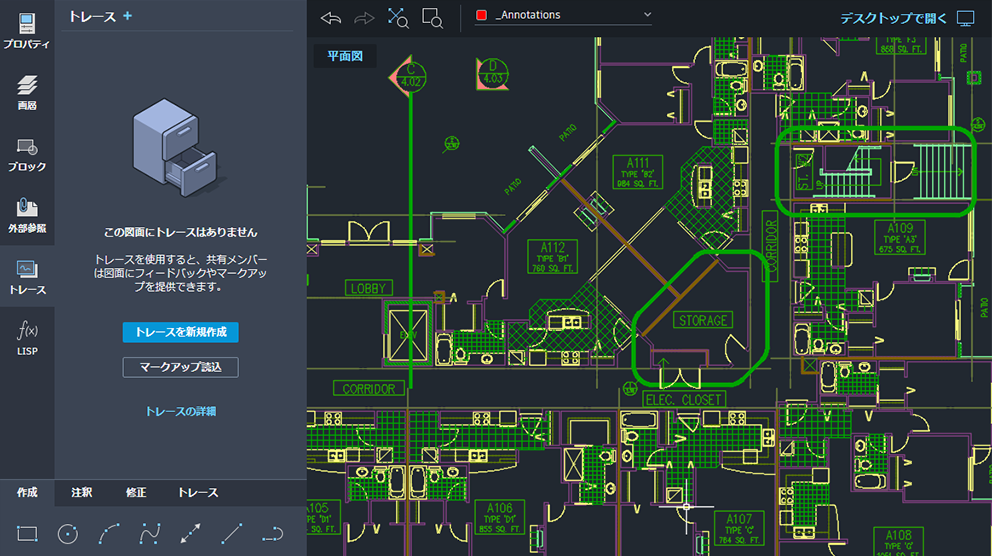 AutoCAD のデスクトップ バージョン(Windows または Mac)、Web バージョン、モバイル バージョンのいずれを使用しているかに応じて、機能は若干異なります。トレースは、デスクトップ、Web、またはモバイル アプリで表示できますが、トレースを作成または編集できるのは、Web およびモバイルを使用している場合のみです。