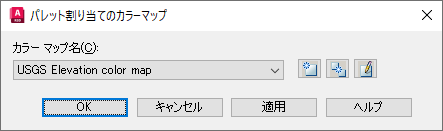 [パレットのカラー マップ定義]ダイアログ ボックスの[範囲テーブル]で、マップの各カラーが 26.387 m の高度範囲を表していることに注意してください。 [OK]をクリックしてダイアログ ボックスを閉じます。 |